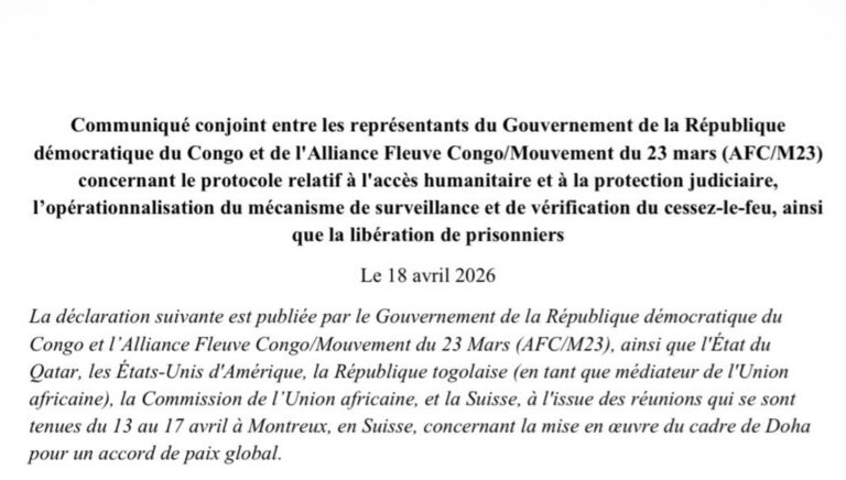 Le Gouvernement de la République démocratique du Congo et l’Alliance Fleuve Congo/Mouvement du 23 mars (AFC/M23) viennent de franchir une étape importante dans le processus de paix, à l’issue des discussions tenues du 13 au 17 avril 2026 à Montreux, en Suisse.